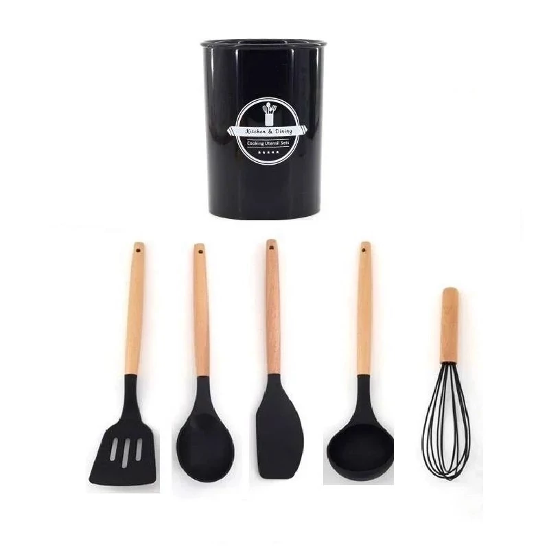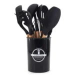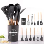 ست ۱۲ پارچه ابزار آشپزی سیلیکونی با دسته چوب بامبو شامل ۱۱ ابزار کاربردی (کفگیر، ملاقه، همزن، چنگال) به همراه پایه سطلی. سری سیلیکونی نسوز تا ۲۲۰ درجه، ایمن برای ظروف نچسب، قابل شستشو در ماشین ظرفشویی؛ یک سرویس کامل و شیک برای آشپزخانه شما.