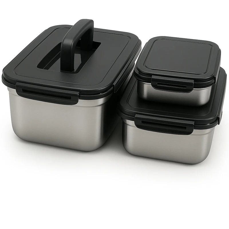 بدنه استیل ضدزنگ باکیفیت: جنس ظروف از استیل درجه یک است که در برابر زنگزدگی، خش و ضربه مقاوم بوده و طعم و بوی مواد غذایی را به خود جذب نمیکند.